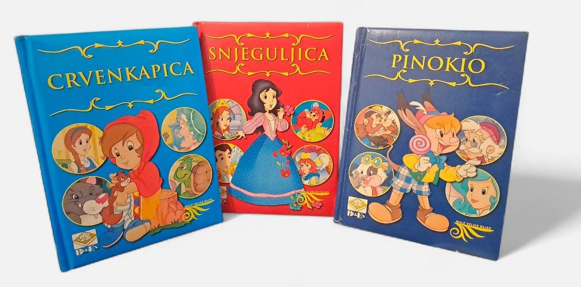 Komplet donosi klasične bajke Crvenkapica, Snjeguljica i Pinokio u jednom izdanju, nudeći djeci poznate priče o hrabrosti, dobroti, iskušenjima i odrastanju.